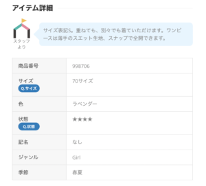 商品説明はこんな感じでスタッフさんのコメントとサイズ、状態などが書かれています。