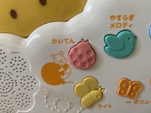メインスイッチをオンにしてすぐに「ごきげん」「やすらぎ」ボタンを押すとメロディのみが流れて回転しないモードになります。