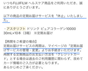 実際私もマイページから定期購入を休止したり再開したりしています。↑こちらは休止した時に届いたメールです。