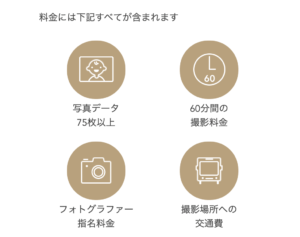 料金の中には写真データ75枚以上、60分間の撮影料金、フォトグラファー指名料金、撮影場所への交通費が含まれます!